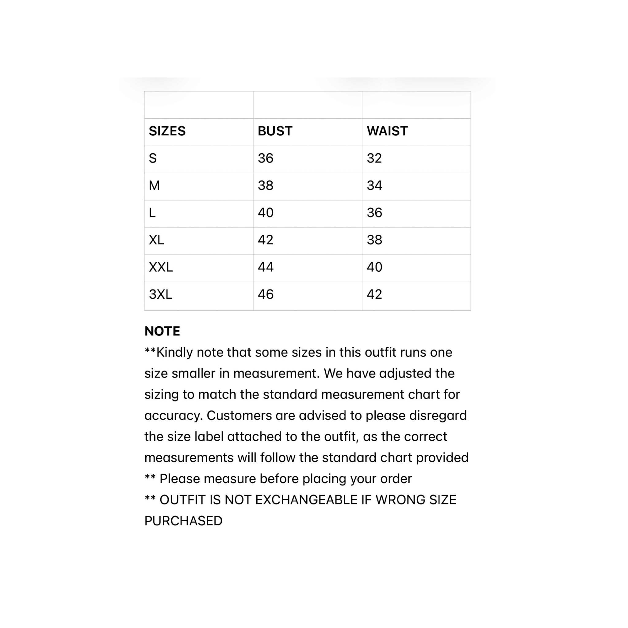 Kindly note that some sizes in this outfit runs one size smaller in measurement. We have adjusted the sizing to match the standard measurement chart for accuracy. Customers are advised to please disregard the size label attached to the outfit, as the correct measurements will follow the standard chart provided.