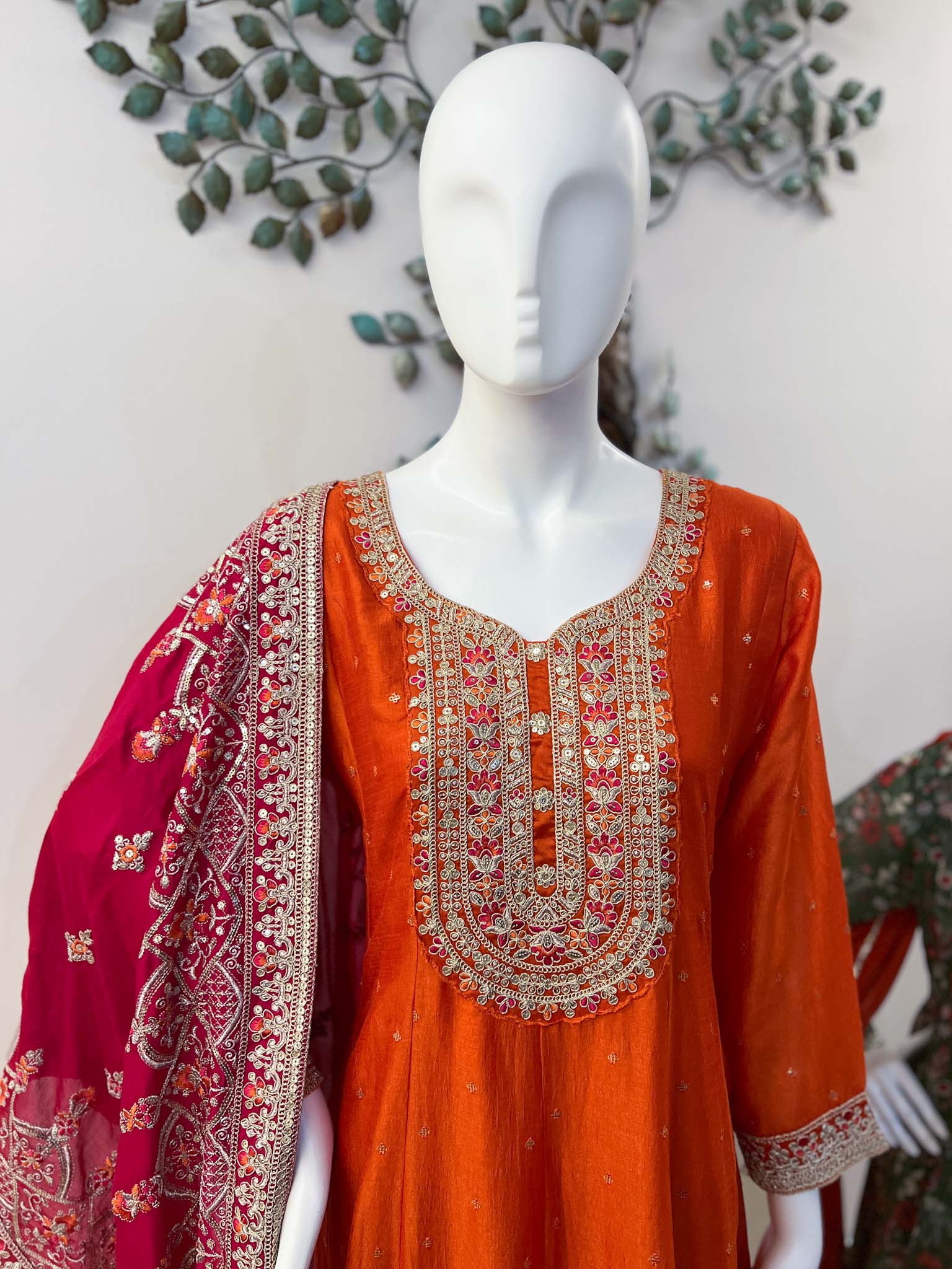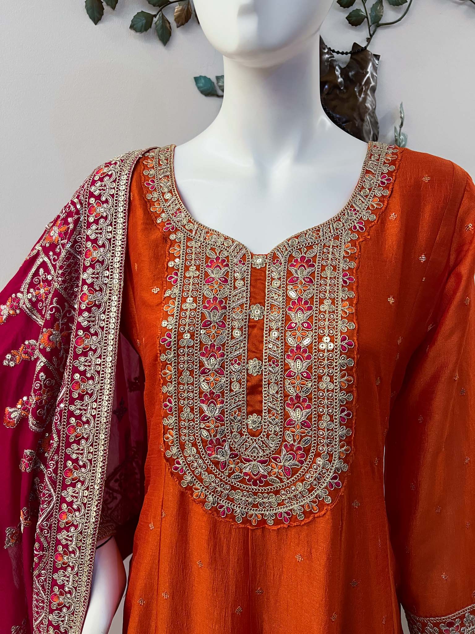 Orange Shade Silk Blend Flared Anarkali Kurta with Lining, Zip at the Side of Kurta, Heavy Machine Embroidery Zari and Sequins Detailing on Yoke, Sleeves and Hem(Front and Back), Small Sequins Work on Front and Back of Body,Pants with Lining and Embroidery Detailing on Hem, Heavy Embroidery Rani Pink Dupatta with Tassels