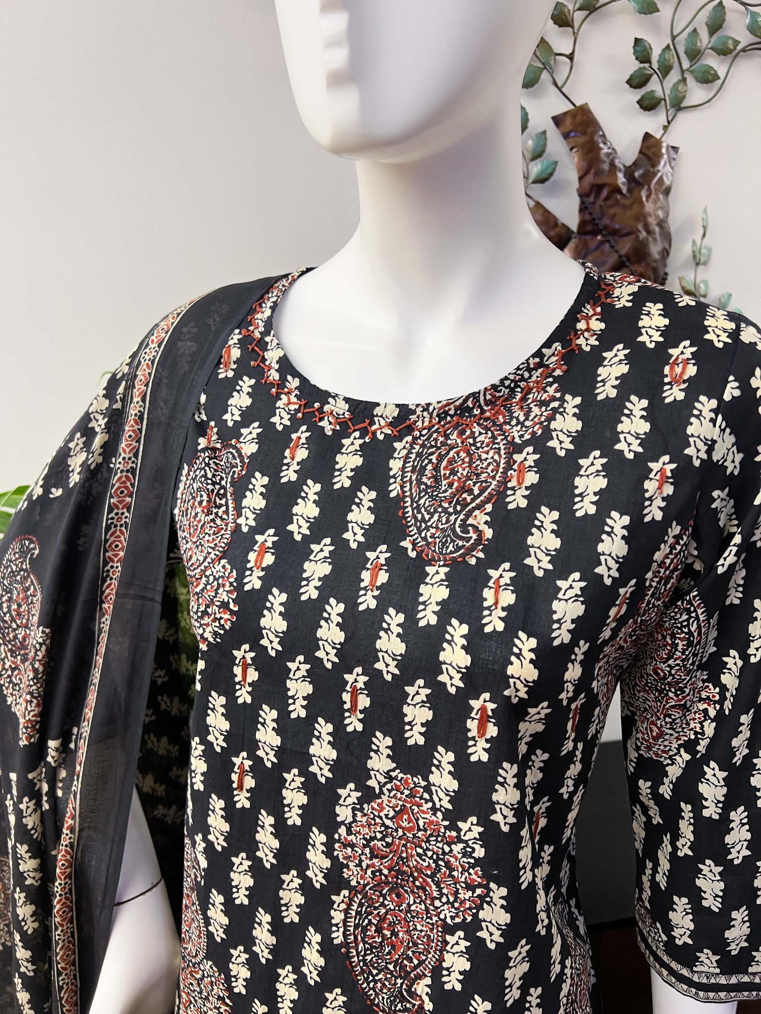 Classic Black Shade Soft Cotton Ajrakh Print Kurta with Minimal Thread and Sequins Work on Yoke, Pants and Cotton Dupatta