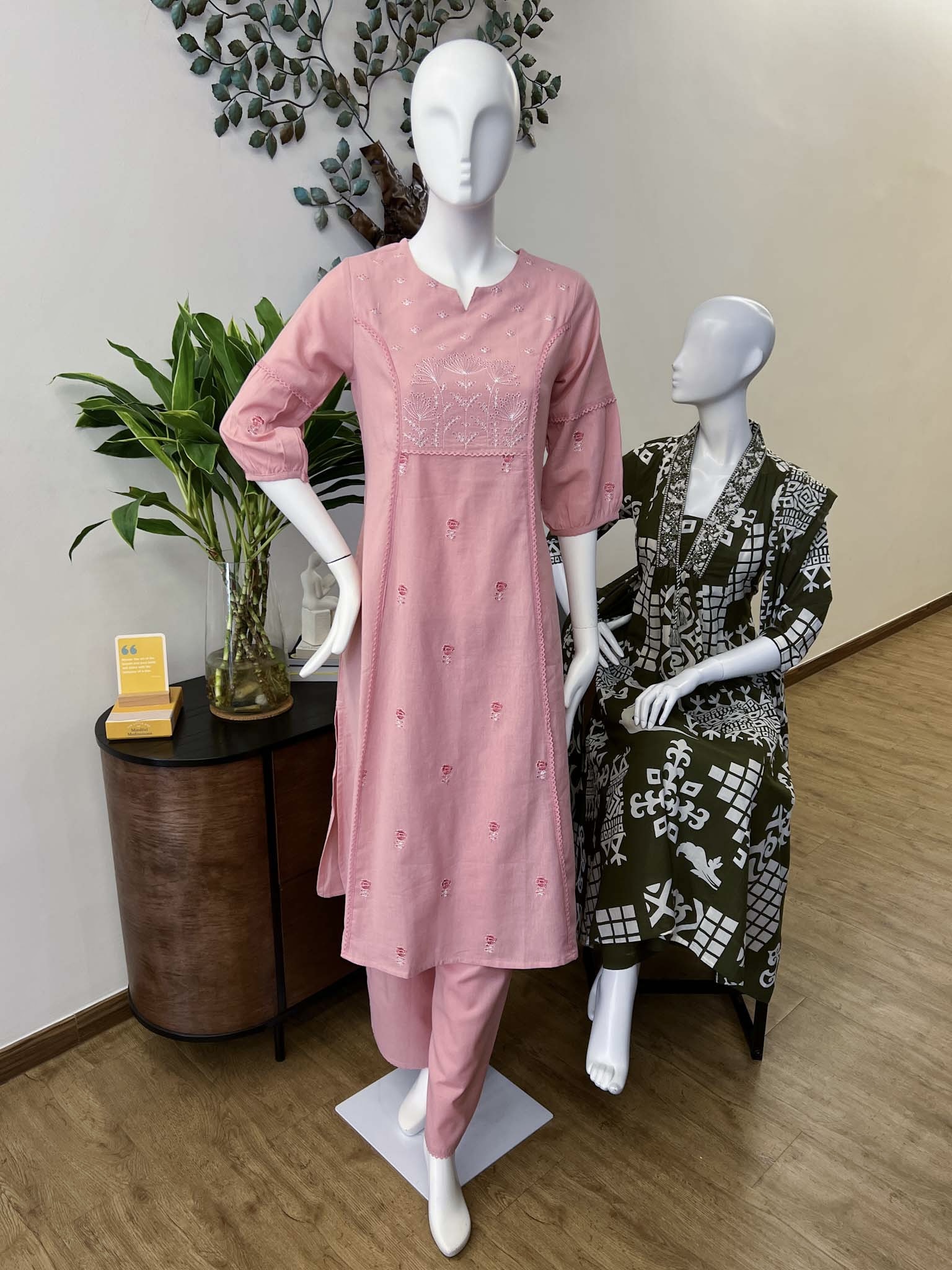 Soft Pink Shade A-Line Cotton Flex Kurta with Machine Embroidery and Lace Work on Body, Have Pocket and Slit & Semi Flared Pants.